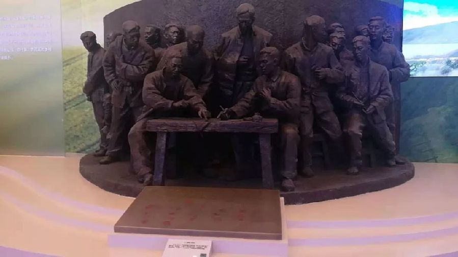 “我們的家鄉,在希望的田野上。”1978年冬,安徽鳳陽縣小崗村18位農民堅定地按下紅手印,實施包產到戶,拉開了中國農村改革的大幕,成為中國改革的標志。這座雕塑讓我們重溫那個永載歷史的瞬間。