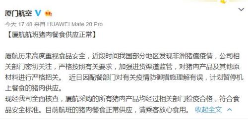 廈航稱,廈航歷來高度重視食品安全,近段時間中國部分地區(qū)發(fā)現(xiàn)非洲豬瘟疫情,公司相關(guān)部門密切關(guān)注,嚴(yán)格按照有關(guān)要求,加強進(jìn)貨渠道監(jiān)管,對豬肉產(chǎn)品及其他原材料進(jìn)行嚴(yán)格把關(guān)。近日,因配餐部門對有關(guān)疫情防御措施理解有誤,計劃暫停機上餐食的豬肉供應(yīng)。