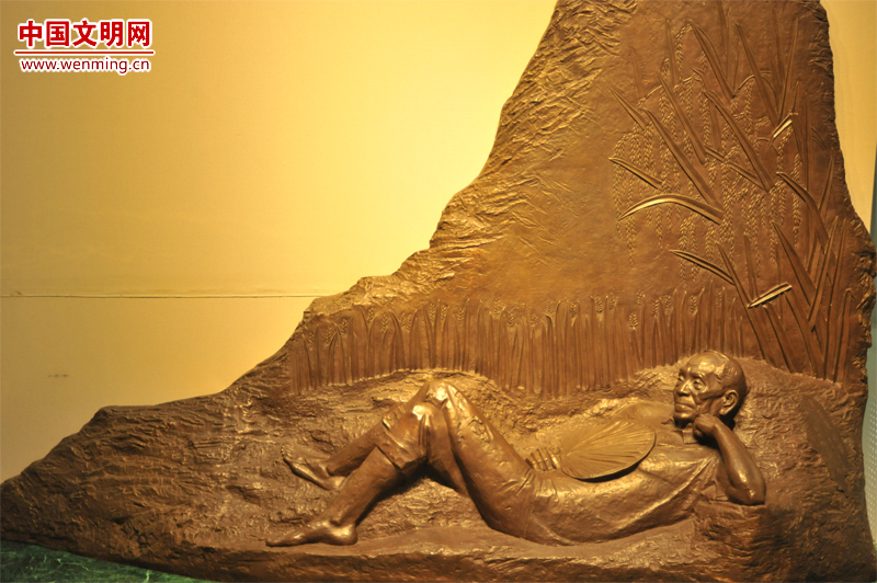 袁隆平“禾下乘涼夢”雕塑。他曾夢見水稻如高粱一般高,穗子和掃把一樣長,谷粒猶如花生米那樣大,人們可以坐在稻穗之下乘涼。湖南雜交水稻研究中心魏科 攝