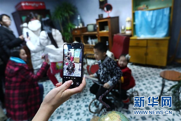 參觀者用手機為兩名小朋友在“時光博物館”內留影。