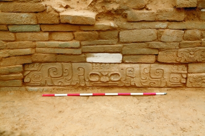 皇城臺(tái)為一處四圍包砌石砌護(hù)墻的高阜臺(tái)地,位于內(nèi)城中部偏西。皇城臺(tái)臺(tái)頂?shù)囊恍┐笮徒ㄖ湓谝惶幋笮团_(tái)基上。2018年,從這處大臺(tái)基南護(hù)墻倒塌的墻體石塊內(nèi),考古隊(duì)出土了30余件石雕作品,有一些石雕還鑲嵌在南護(hù)墻墻面上。這些石雕絕大多數(shù)是雕刻于石塊一面的單面雕刻,有符號(hào)、人面、神面、動(dòng)物、神獸等,有一些畫面長(zhǎng)度近3米,以中心正臉的神面為中心,兩側(cè)對(duì)稱雕出動(dòng)物和側(cè)臉人面,體現(xiàn)出成熟的藝術(shù)構(gòu)思和精湛的雕刻技藝。