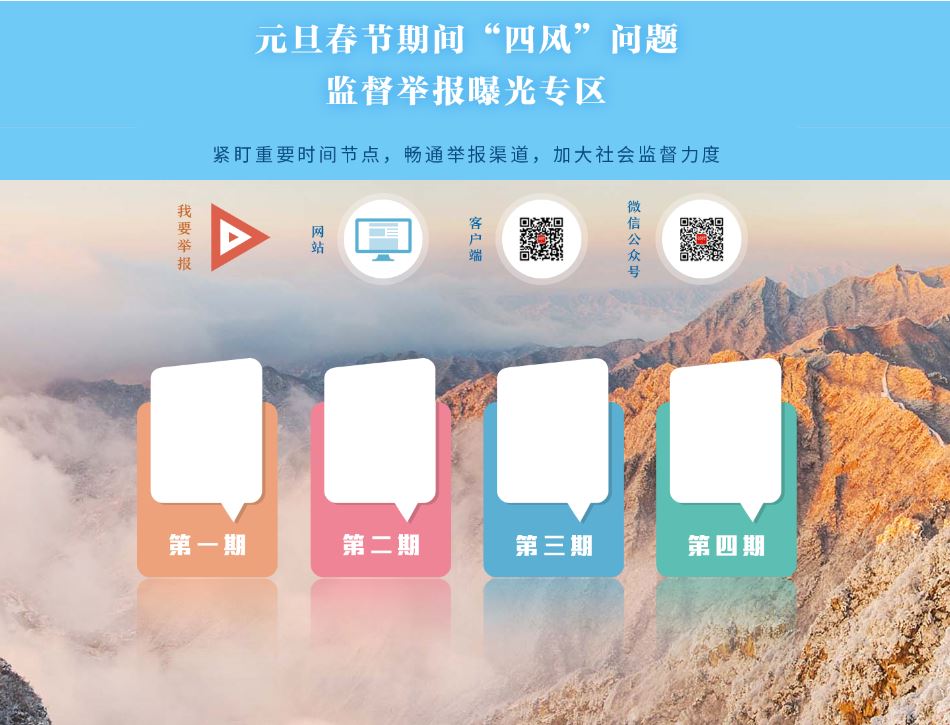 2019年元旦、春節(jié)將至,為切實(shí)抓好節(jié)日期間落實(shí)中央八項(xiàng)規(guī)定及其實(shí)施細(xì)則精神、糾正“四風(fēng)”工作,營(yíng)造風(fēng)清氣正節(jié)日氛圍,中央紀(jì)委國(guó)家監(jiān)委網(wǎng)站推出“元旦春節(jié)期間‘四風(fēng)’問題監(jiān)督舉報(bào)曝光專區(qū)”,暢通監(jiān)督舉報(bào)渠道,加大典型案例通報(bào)曝光力度,增強(qiáng)警示震懾和教育引導(dǎo)作用。