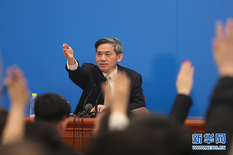 3月4日,十三屆全國人大一次會議在人民大會堂新聞發布廳舉行新聞發布會,由大會發言人張業遂就大會議程和人大工作相關的問題回答中外記者的提問。圖為新聞發布會主持人何紹仁。新華網/中國政府網 陳杰 攝