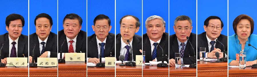 3月6日,全國政協十三屆一次會議在北京人民大會堂舉行記者會,民主黨派中央和全國工商聯領導人回答記者提問。這是民革中央主席萬鄂湘(左五)、民盟中央主席丁仲禮(右四)、民建中央主席郝明金(左四)、民進中央主席蔡達峰(右三)、農工黨中央主席陳竺(左三)、致公黨中央主席萬鋼(右二)、九三學社中央主席武維華(左二)、臺盟中央主席蘇輝(右一)、全國工商聯主席高云龍(左一)在記者會上(拼版照片)。新華社發
