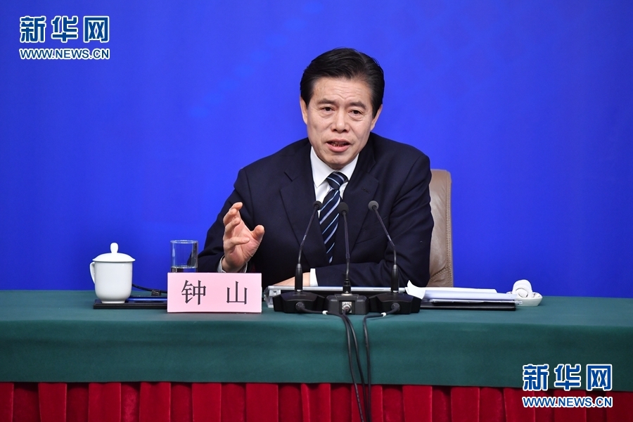 3月11日,十三屆全國人大一次會議新聞中心舉行記者會,邀請商務部部長鐘山、副部長兼國際貿易談判副代表王受文、副部長錢克明就“推動形成全面開放新格局推動商務事業高質量發展”相關問題回答中外記者提問。這是鐘山在回答記者提問。 新華社記者 李鑫 攝