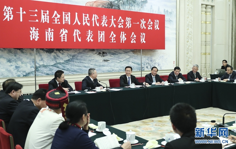 韓正在海南代表團參加審議。在認真聽取劉賜貴、沈曉明、陳飄等代表發言后,韓正說,完全贊同全國人大常委會工作報告。報告圍繞中心、突出重點、客觀實在,通篇貫穿了習近平新時代中國特色社會主義思想,體現了堅持黨的領導、人民當家作主、依法治國的有機統一。韓正說,海南在國家發展全局中地位作用更顯重要,要以習近平新時代中國特色社會主義思想為指導,落實黨中央決策部署和習近平總書記對海南發展的重要指示精神,以慶祝改革開放40周年和海南建省辦經濟特區30周年為契機,以國際旅游島建設為總抓手,把保護生態環境放在優先位置,加快建設經濟繁榮、社會文明、生態宜居、人民幸福的美好新海南。
