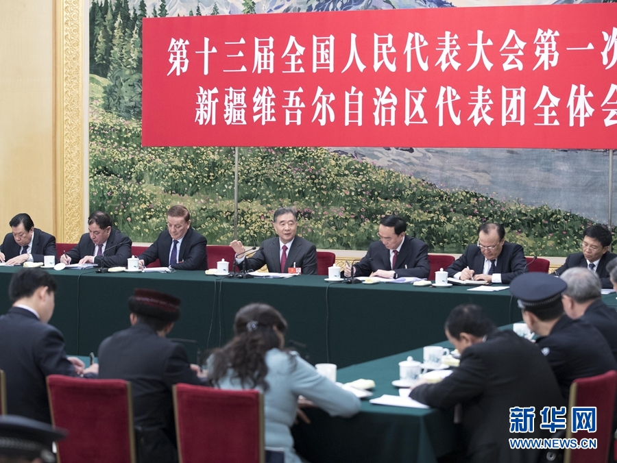 3月12日,中共中央政治局常委、國務院副總理汪洋參加十三屆全國人大一次會議新疆代表團的審議。 新華社記者 王曄 攝