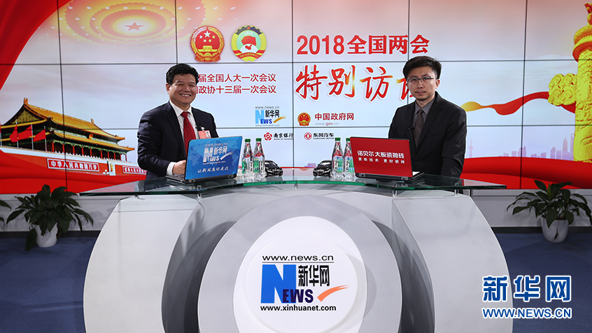 3月13日,全國人大代表、山東省淄博市原山林場黨組書記孫建博(左)做客新華網2018全國兩會特別訪談。新華網 郭小天攝