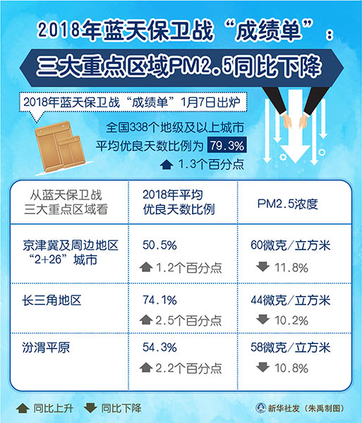 圖表:2018年藍天保衛戰“成績單”:三大重點區域PM2.5同比下降 新華社發 朱禹 制圖