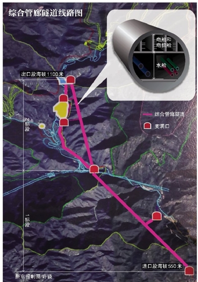 怎樣把對生態環境的影響降到最低是施工隊面臨的另一項考驗。在施工方案的選擇上,設計團隊曾想過另外一種建設方案,但最終被否定?!白畛醯姆桨甘窃谏狡律献鰷锨瑥纳较掳阉\送到山上,但這種方法只能用來運水,而且要砍伐大量樹木,生態破壞嚴重。” 韓寶江說,采用地下綜合管廊的建設方式,不但可以同時輸送電力和水,而且伐樹少,占地面積小,能夠最大程度保護山體生態環境。為減少對野生動物生活習性的影響,施工隊在爆破時也盡可能在白天進行。