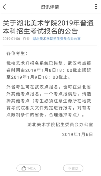 1月6日,湖北美術學院發布的報名時間順延通告。