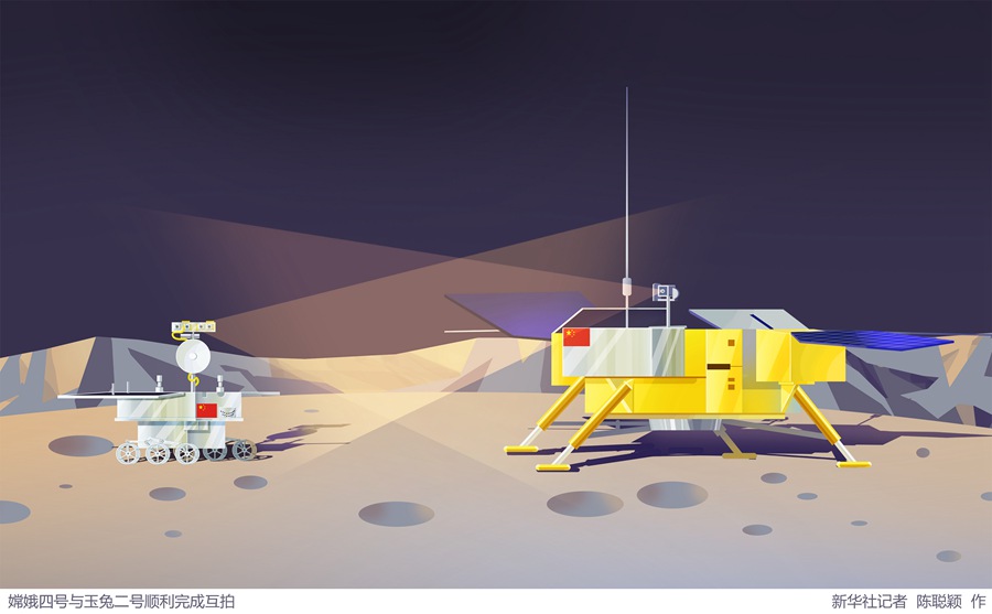 插畫:嫦娥四號與玉兔二號順利完成互拍 新華社記者 陳聰穎 作