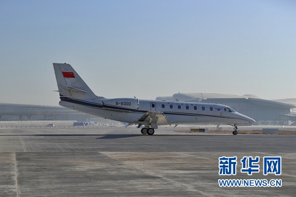 1月22日10時10分,一架“獎狀680”校驗飛機平穩降落在北京大興國際機場西一跑道上,留下了第一道飛機輪胎印跡,意味著北京新機場第一場校驗任務圓滿完成,機場工程建設即將進入驗收移交階段。 新華社發(汪洋 攝)