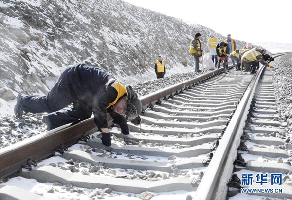 青藏鐵路格爾木工務段望昆線路養護車間副主任于本蕃(前)跪在鐵路上對已完成檢修的鐵軌進行復檢(1月11日攝)。 新華社發(王浡 攝)