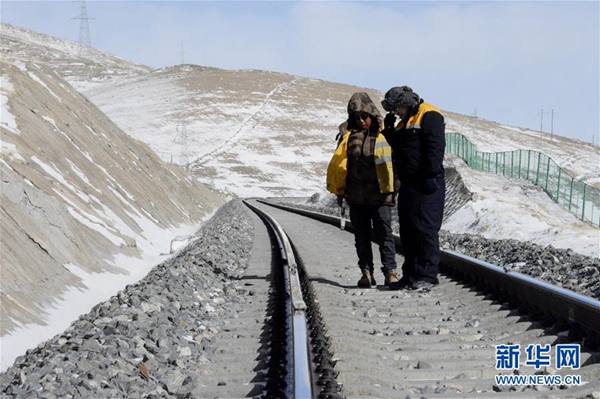 青藏鐵路格爾木工務段望昆線路養護車間副主任于本蕃(右)和工友一起檢查軌道平順度(1月11日攝)。 新華社發(王浡 攝)