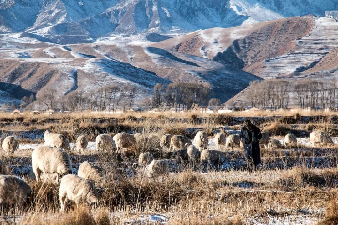 2018-12-22,甘肅省張掖市民樂縣。冬日里一片蒼茫,在寒風中,一個牧羊人正在守望著他的羊群。作者:清風撫柳