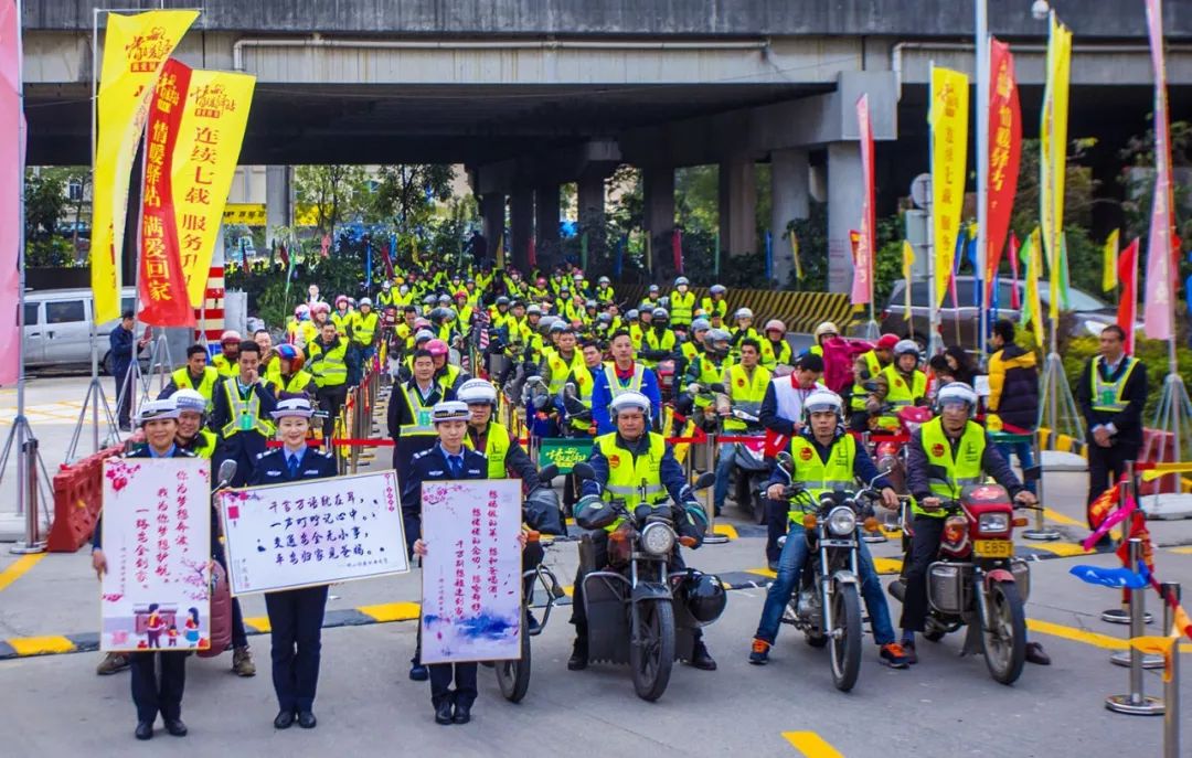 2019-01-21,廣東省佛山市。春運(yùn)開始,摩托回鄉(xiāng)大軍在交警引導(dǎo)下有序前進(jìn),女警手提的告示牌上寫著“平安歸家見爸媽”。作者:獲得生命