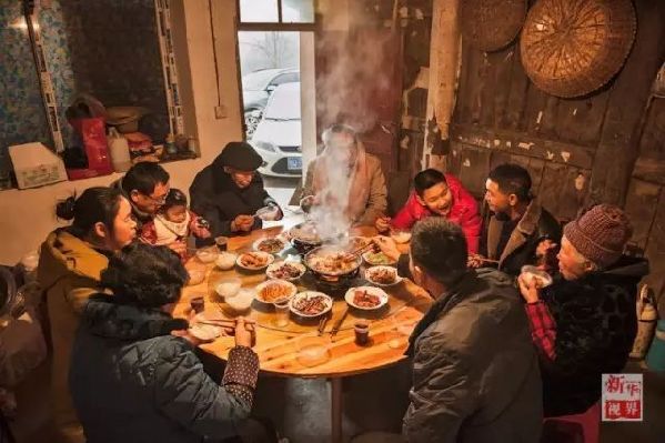 湖北省建始縣花坪鄉張家槽村的一戶家庭圍坐一起吃團圓飯。新華社發(周阿寒 攝)
