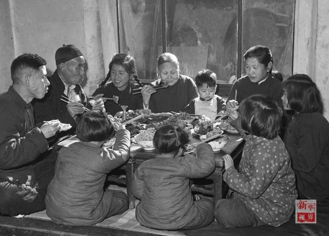 ↑1953年,天津市漢沽區蘆臺王德鑄(左一)一家吃團圓飯。