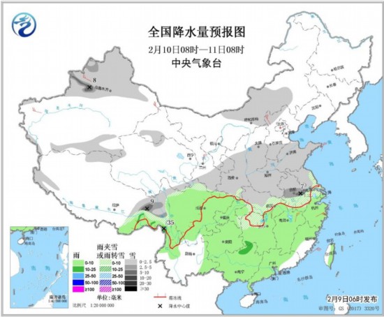 圖2 全國降水量預報圖(2月9日08時-10日08時)