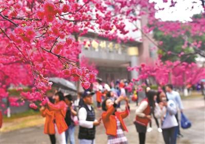 華南農業大學內的櫻花盛開,引來不少市民賞花拍花。記者廖雪明 攝