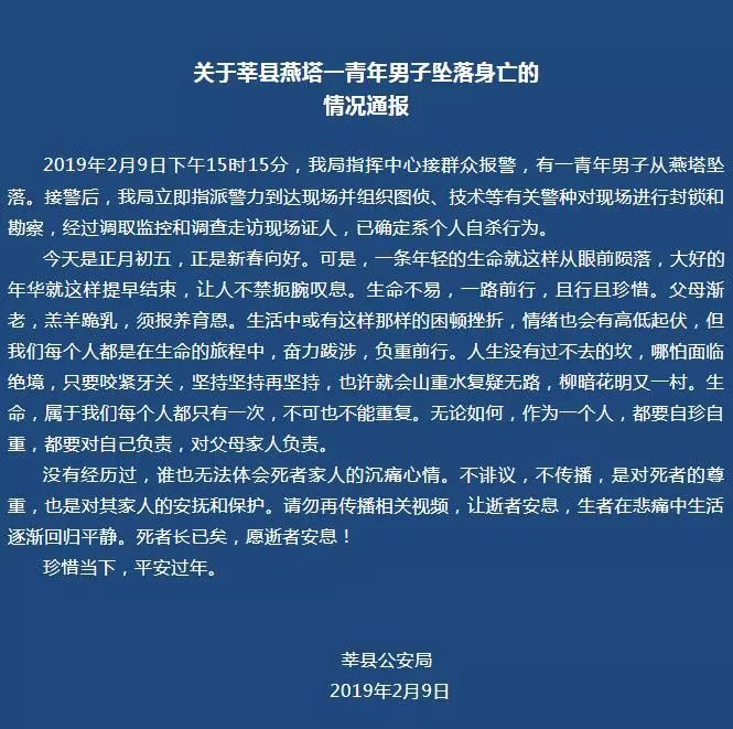 2月9日,山東莘縣公安局通過官方微信,通報了“莘縣燕塔一青年男子墜落身亡”事件。
