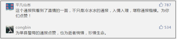 撰寫這份通報的莘縣公安局宣傳科室相關負責人稱,通報發(fā)布后,他們收獲了很多暖心留言。“其實我們這樣寫通報的原因很簡單,就是站在死者家屬的角度、立場去考慮這個事情。”