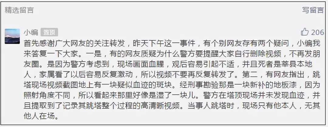 “我們就在通報的基礎上,通過留言進行了辟謠和提醒。”警方表示,就此事有個別網(wǎng)友存有兩個疑問:一是,質(zhì)疑為什么警方要提醒大家自行刪除視頻。警方解釋,現(xiàn)場畫面血腥,觀后容易引起不適,并且死者是莘縣本地人,家屬看了以后容易反復激動。二是,網(wǎng)友指出,跳塔現(xiàn)場視頻截圖地上有一塊疑似血跡的斑塊。經(jīng)刑事勘驗那是一塊新補的地板漆,因照射角度不同,所以看起來那里好像是濕了一塊兒。警方在現(xiàn)場并未發(fā)現(xiàn)血跡,此外,當事人跳塔時,現(xiàn)場只有他本人。