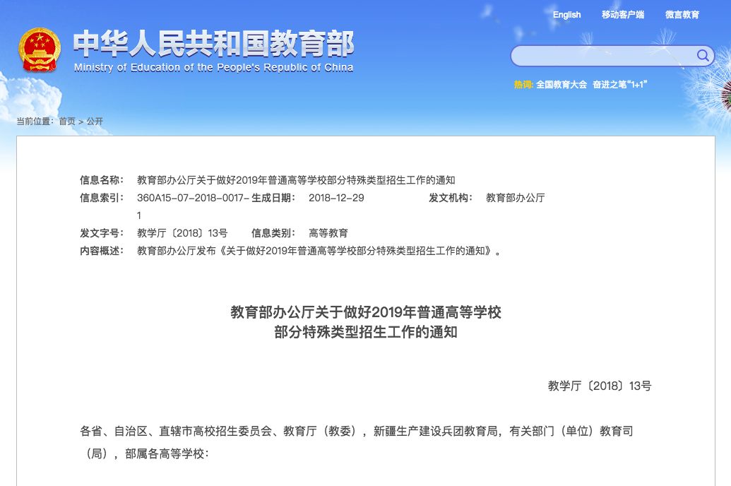 中國青年報注意到,去年12月,教育部下發《關于做好2019年普通高等學校部分特殊類型招生工作的通知》,發布2019年普通高等學校部分特殊類型招生基本要求。