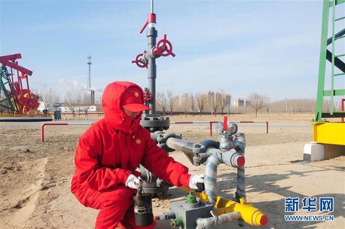 大慶油田中四采油隊采油工秦梅在巡查采油“磕頭機”(2月3日攝)。新華社記者 管建濤 攝