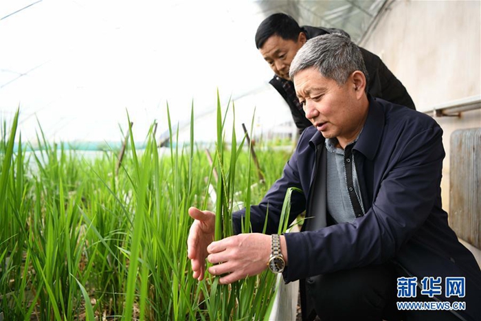 孫斌(前)在黑龍江省樺南縣水稻分子育種研發中心溫室大棚查看育種水稻長勢(2月2日攝)。新華社記者 王建威 攝