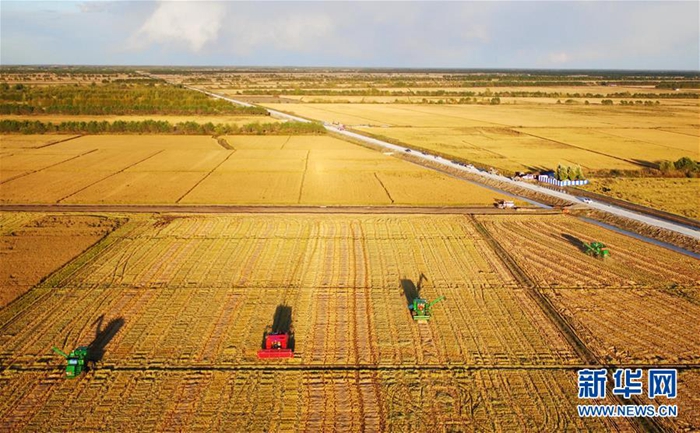 大型農機在黑龍江省三江平原上收割水稻(2017年9月28日無人機拍攝)。新華社記者 王建威 攝