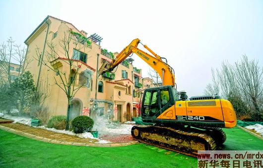 ▲2月19日,大型機(jī)械在拆除石家莊市鹿泉區(qū)“西美金山湖”房地產(chǎn)項(xiàng)目違規(guī)別墅。本報(bào)記者王曉攝