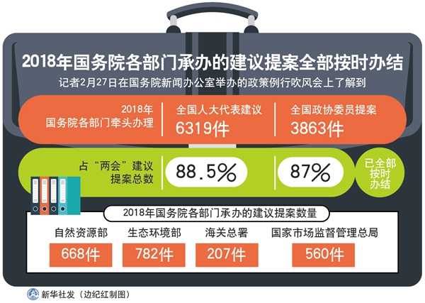 新華社北京2月27日電(胡璐、張涵)2018年,國務院各部門牽頭辦理全國人大代表建議6319件,全國政協委員提案3863件,分別占“兩會”建議提案總數的88.5%和87%,已全部按時辦結。
