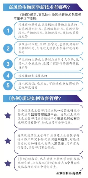 張新慶建議,《條例》出臺后應盡快出臺新技術風險管理目錄,以及相應的分類技術標準和倫理審查指南等配套細則,為省級和國務院衛生主管部門審批提供依據。另外,衛生主管部門在新技術臨床研究和應用過程中加強監督、指導,并進行階段性評估,及時發現問題并改進。(記者許雯 制圖/高俊夫)