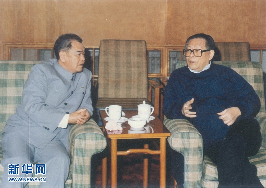 1989年,江澤民同志與毛致用同志在一起。 新華社發
