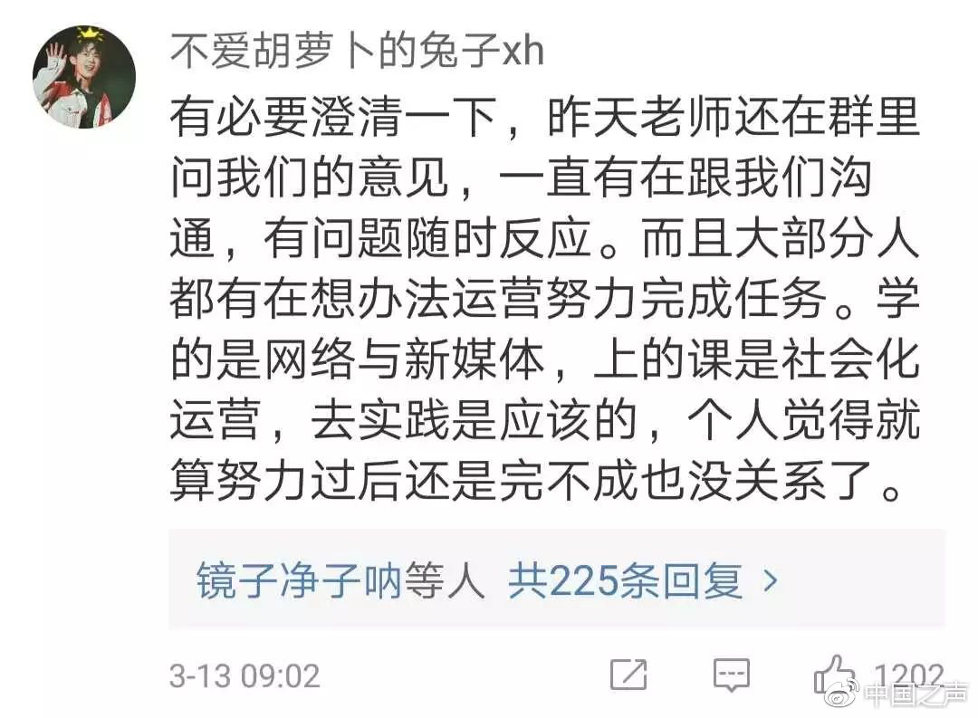 也有學生認為,比起課本上知識,在校學習也應注重實踐,有時候一些課程或課間作業看似無厘頭,背后也有老師們的良苦用心。不少走上工作崗位的同學,在一段時間之后才體會到當年自己曾吐槽的那門課程所教會自己的東西:“大部分同學有在想辦法完成這樣一個運營任務,學的是網絡與新媒體,我覺得去實踐是應該的,自己覺得就算努力過后完不完成任務也沒所謂,你去實踐了很重要。”