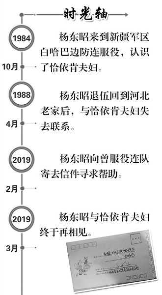 隨著時間的推移,楊東昭這個當年20歲的小伙子如今已年過半百,雖然日子過得越來越紅火,但內心對兩位哈薩克族老人的思念越發強烈。在千家萬戶團聚歡樂的鞭炮聲中,他提筆寫了一封信寄到曾經服役的連隊尋求幫助。