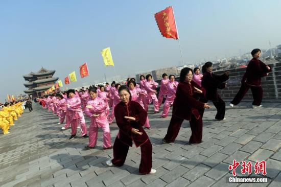 資料圖:山西大同,民眾在古城墻上表演太極拳。 中新社記者 武俊杰 攝