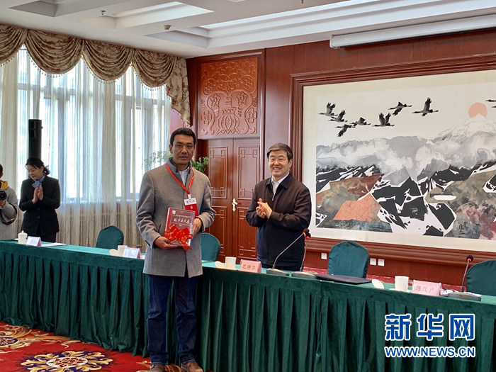 全國政協副主席、國家民委主任巴特爾(右一)向相關單位贈書。新華網 王頔 攝