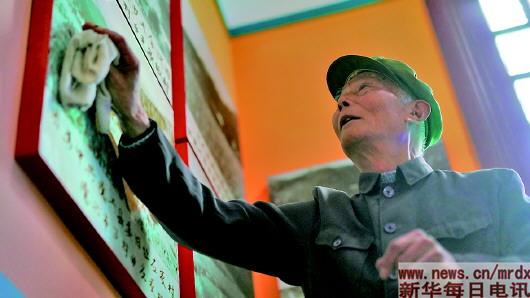 3月27日,程樟柱在紀念館內擦拭介紹烈士事跡的展板。