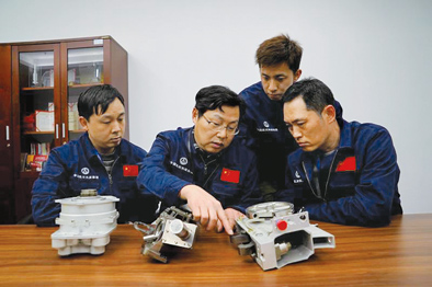 4月3日,王曙群(左二)給團隊成員講解對接機構組件的裝配要領。新華每日電訊記者張建松攝