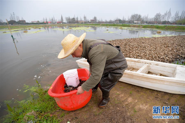 在湖南省南縣一處稻蝦蟹綜合種養(yǎng)基地,農(nóng)戶在捕收蝦蟹(3月13日攝)。新華社發(fā)(陳澤國 攝)