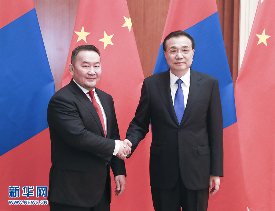 李克強表示,中蒙是山水相連的友好鄰邦。今年適逢中蒙建交70周年和《中蒙友好合作關(guān)系條約》修訂25周年,兩國關(guān)系迎來新的發(fā)展機遇。習近平主席將同總統(tǒng)先生舉行會談,規(guī)劃兩國關(guān)系下一步發(fā)展。中方愿同蒙方加強政治互信,尊重彼此核心利益和重大關(guān)切,推動中蒙全面戰(zhàn)略伙伴關(guān)系再上新臺階。我們愿在相互尊重、平等合作、互利互惠的基礎(chǔ)上深化雙方務(wù)實合作,將“一帶一路”倡議同蒙方“發(fā)展之路”倡議對接,加快推進中蒙自貿(mào)協(xié)定和經(jīng)濟合作區(qū),深化在農(nóng)業(yè)、產(chǎn)能、人文等領(lǐng)域的交流合作,繼續(xù)在邊境運輸、口岸建設(shè)等方面為蒙方提供便利。