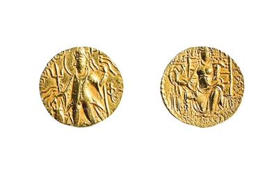 貴霜帝國伽膩色迦三世金幣 貴霜帝國伽膩色迦三世時(shí)期(約公元250—270年)鑄造,重7.9克、直徑21.5毫米 中國錢幣博物館藏