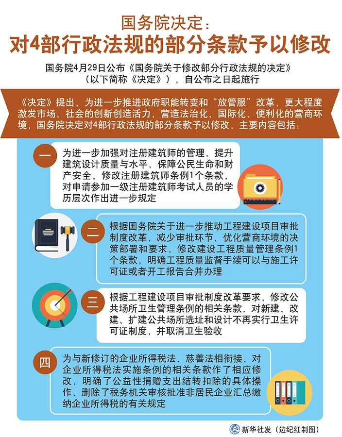 為進一步推進政府職能轉(zhuǎn)變和“放管服”改革,更大程度激發(fā)市場、社會的創(chuàng)新創(chuàng)造活力,營造法治化、國際化、便利化的營商環(huán)境,國務(wù)院對涉及的行政法規(guī)進行了清理。經(jīng)過清理,國務(wù)院決定:對4部行政法規(guī)的部分條款予以修改。