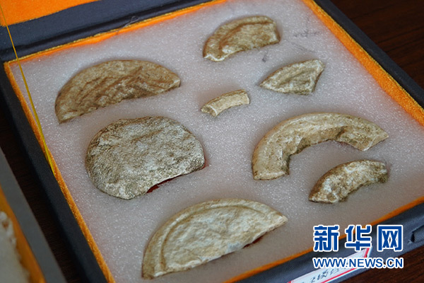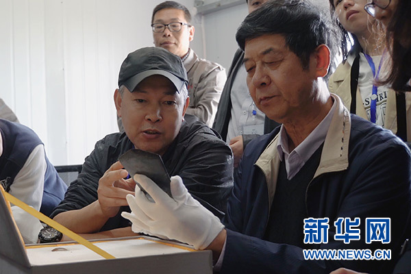4月29日,考古學家研究討論黃山遺址新出土的玉鉞。 新華社記者 袁月明 攝
