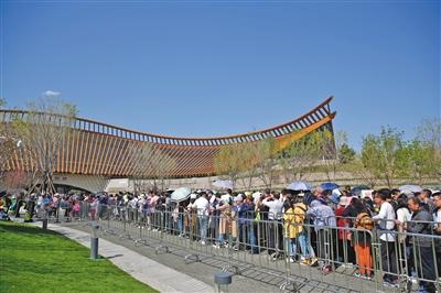 昨日,五一小長假第一天,世園會迎來開園后的首個客流高峰。圖為當(dāng)日下午三時許,中國館前排隊的游客。新京報記者 侯少卿 攝