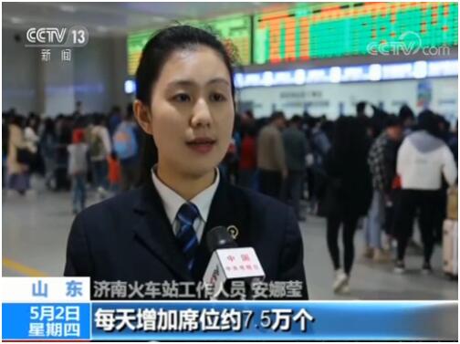 濟(jì)南火車(chē)站工作人員 安娜瑩:我們?cè)鲩_(kāi)列車(chē)216趟,320趟動(dòng)車(chē)組列車(chē)由八節(jié)車(chē)廂改為十六節(jié)車(chē)廂重聯(lián)運(yùn)行,每天增加席位約7.5萬(wàn)個(gè)。