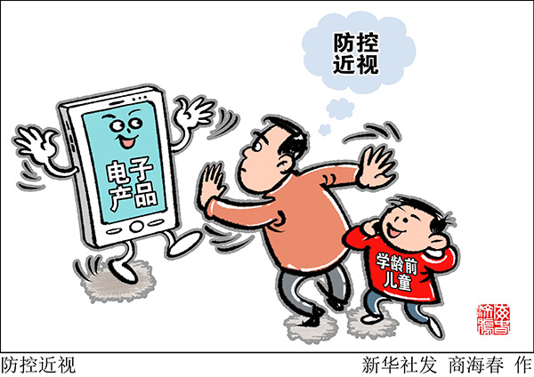 核心信息指出,長時間或近距離盯著手機、電腦和電視等電子屏幕,是近視的原因之一。6歲以下兒童要盡量避免使用手機和電腦。家長在孩子面前應盡量少使用電子產品。